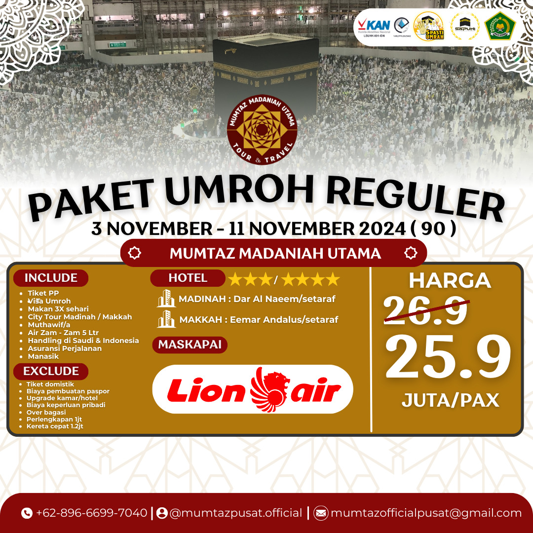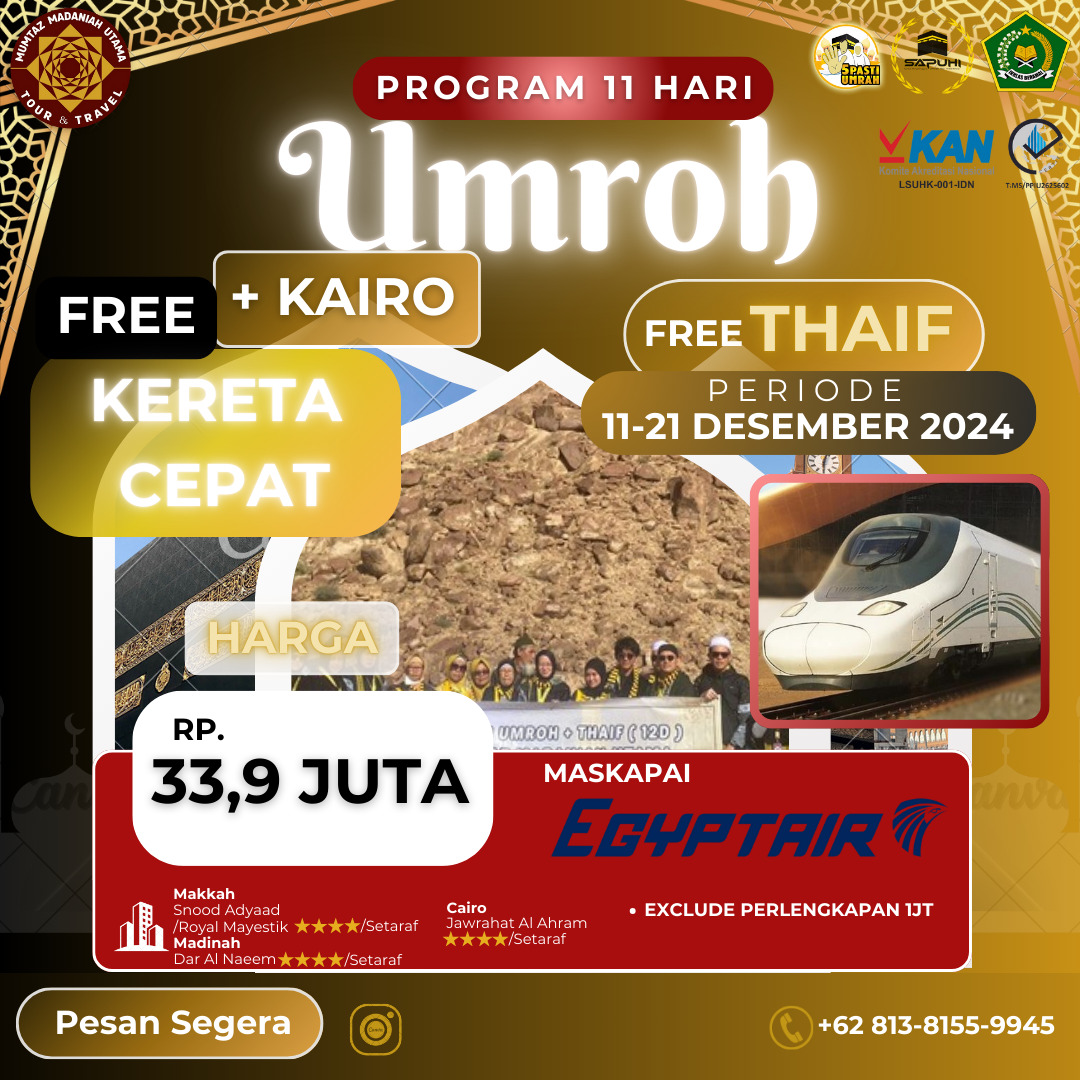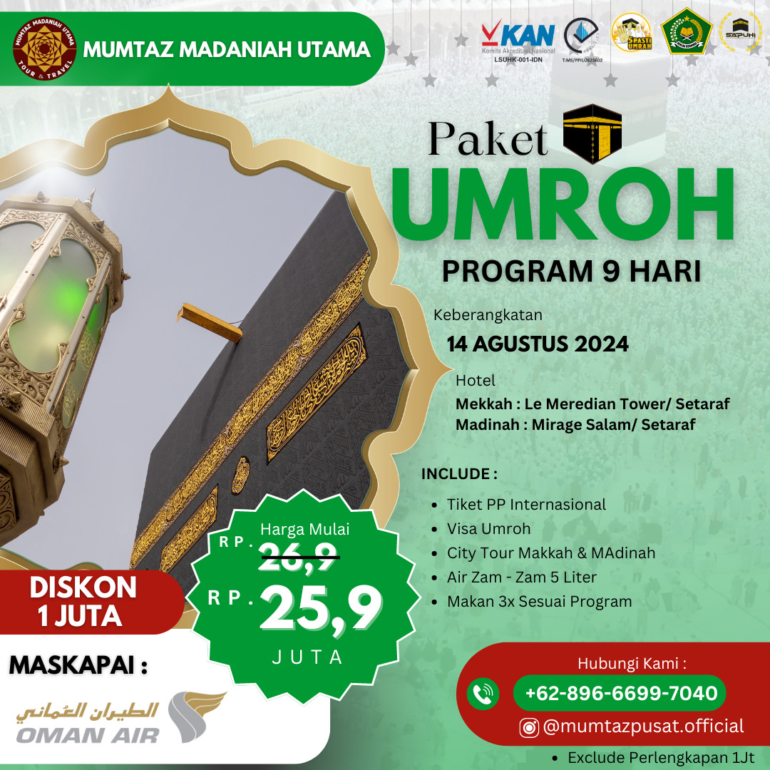 Dengan layanan yang menyeluruh dan profesional, kami memastikan setiap langkah perjalanan Anda menuju Tanah Suci adalah pengalaman yang nyaman dan memuaskan.